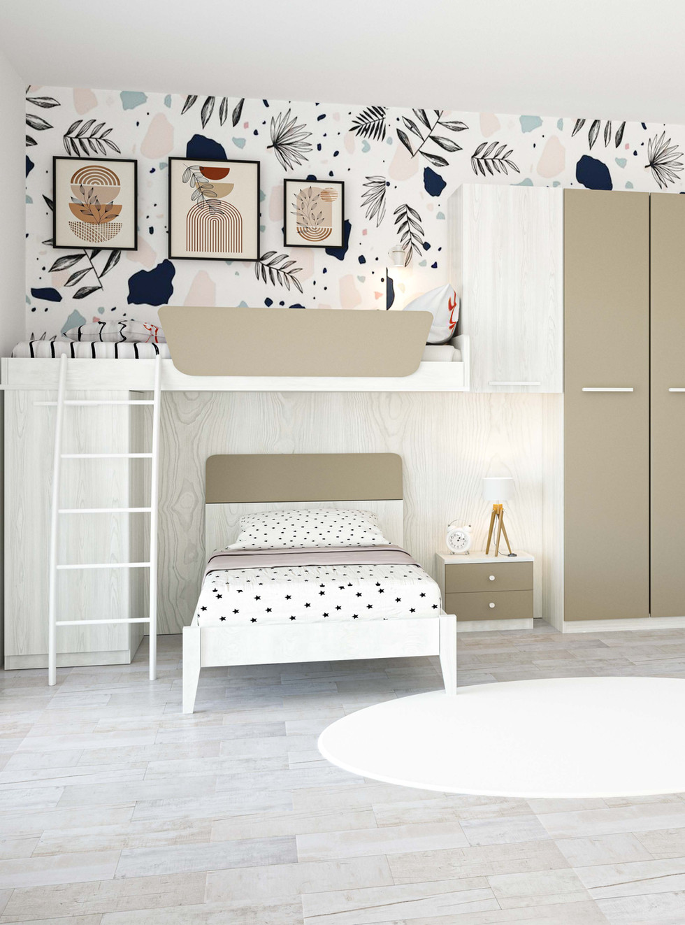 Soluzioni salvaspazio: letti a soppalco, scrivanie integrate e armadi capienti progettati per ottimizzare lo spazio anche nelle camerette più piccole.